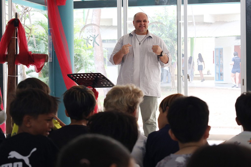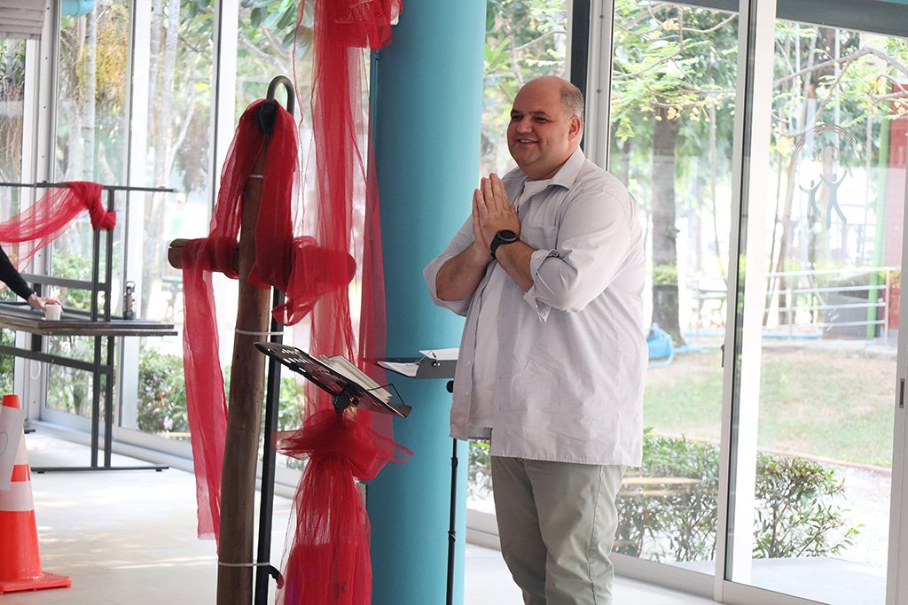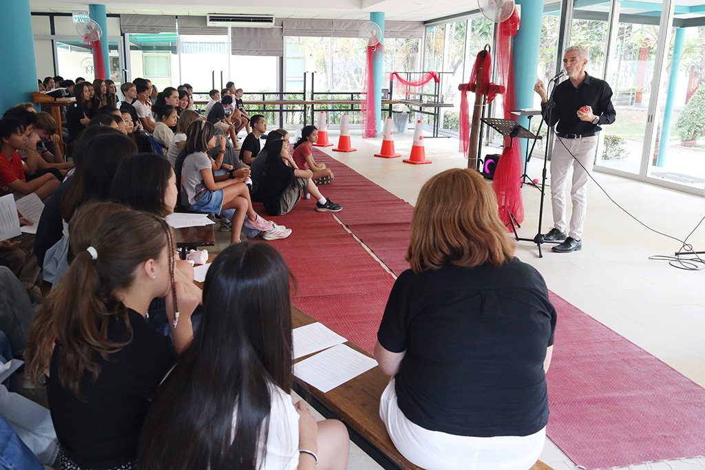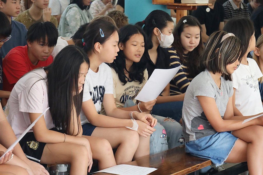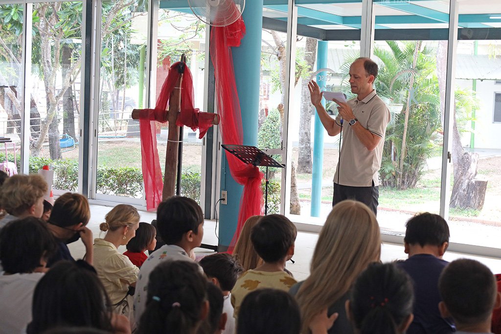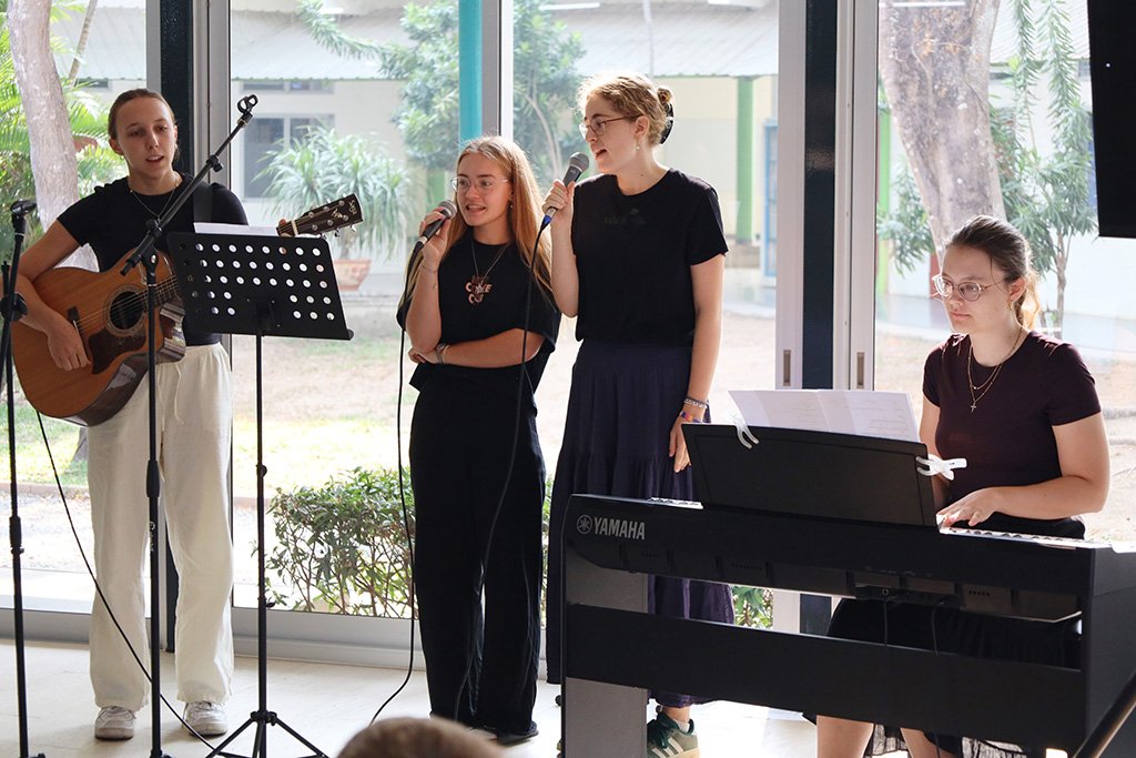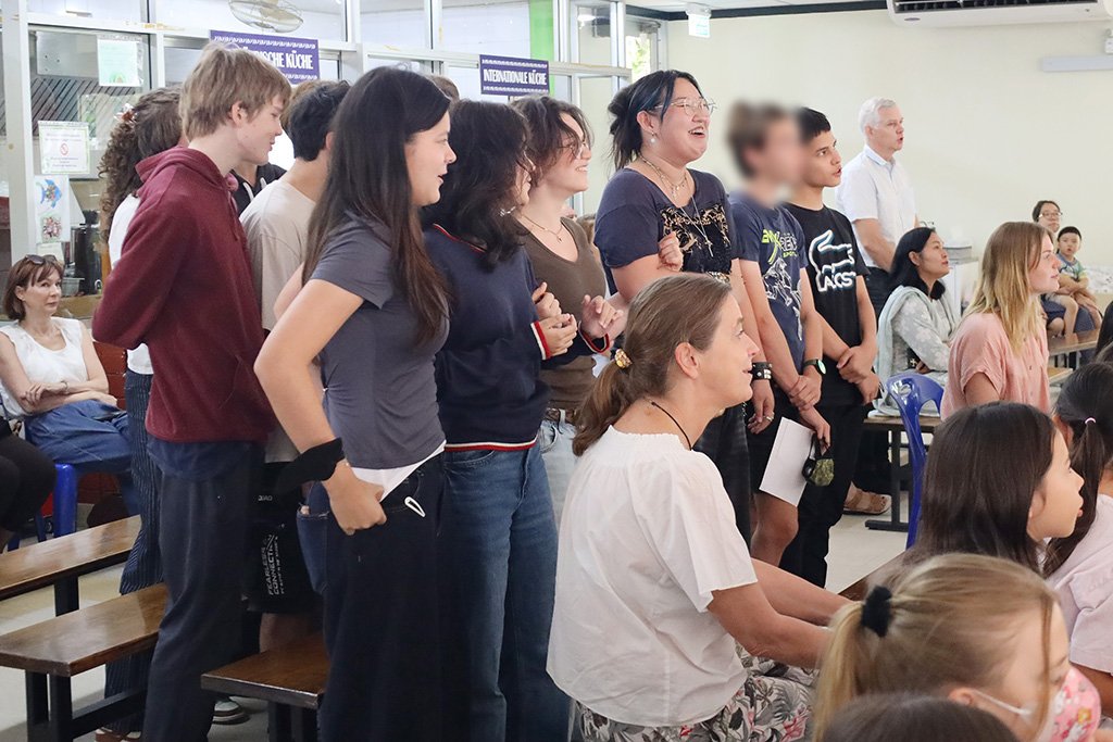 Aufgrund der begrenzten Raumkapazität wurde die Veranstaltung in zwei Teile gegliedert. Zunächst kamen Kindergarten- und Grundschulkinder zusammen, im Anschluss folgte der Gottesdienst für die Schülerinnen und Schüler der Oberstufe. Beide Feiern fanden erstmals im neu gestalteten Kantinengebäude statt. Die modernisierten Räumlichkeiten mit neuen Fenstern und Wänden sorgten für eine spürbar angenehme Umgebung – die Luft war frisch und kühl.